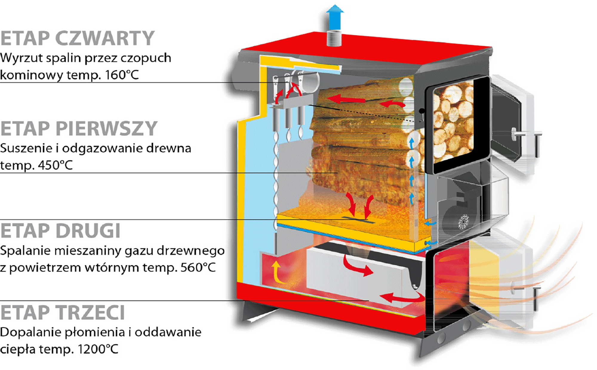 W pierwszym etapie, w komorze załadunkowej, zachodzi piroliza – proces rozkładu drewna w wysokiej temperaturze bez udziału tlenu. W jego wyniku powstaje gaz drzewny bogaty w związki palne. Następnie gaz ten trafia do dolnej komory, gdzie przy udziale powietrza wtórnego spalany jest w bardzo wysokiej temperaturze, co pozwala uzyskać wysoką sprawność oraz niską emisję zanieczyszczeń.